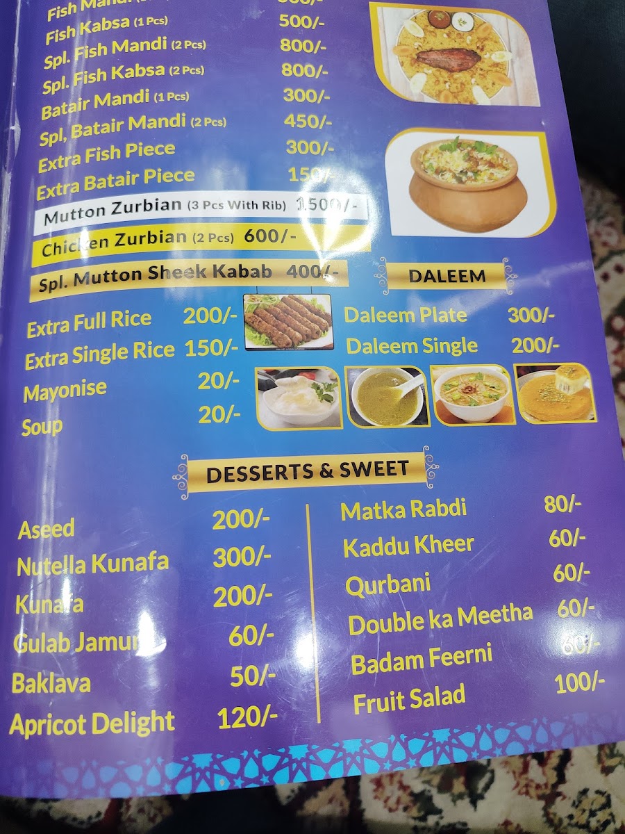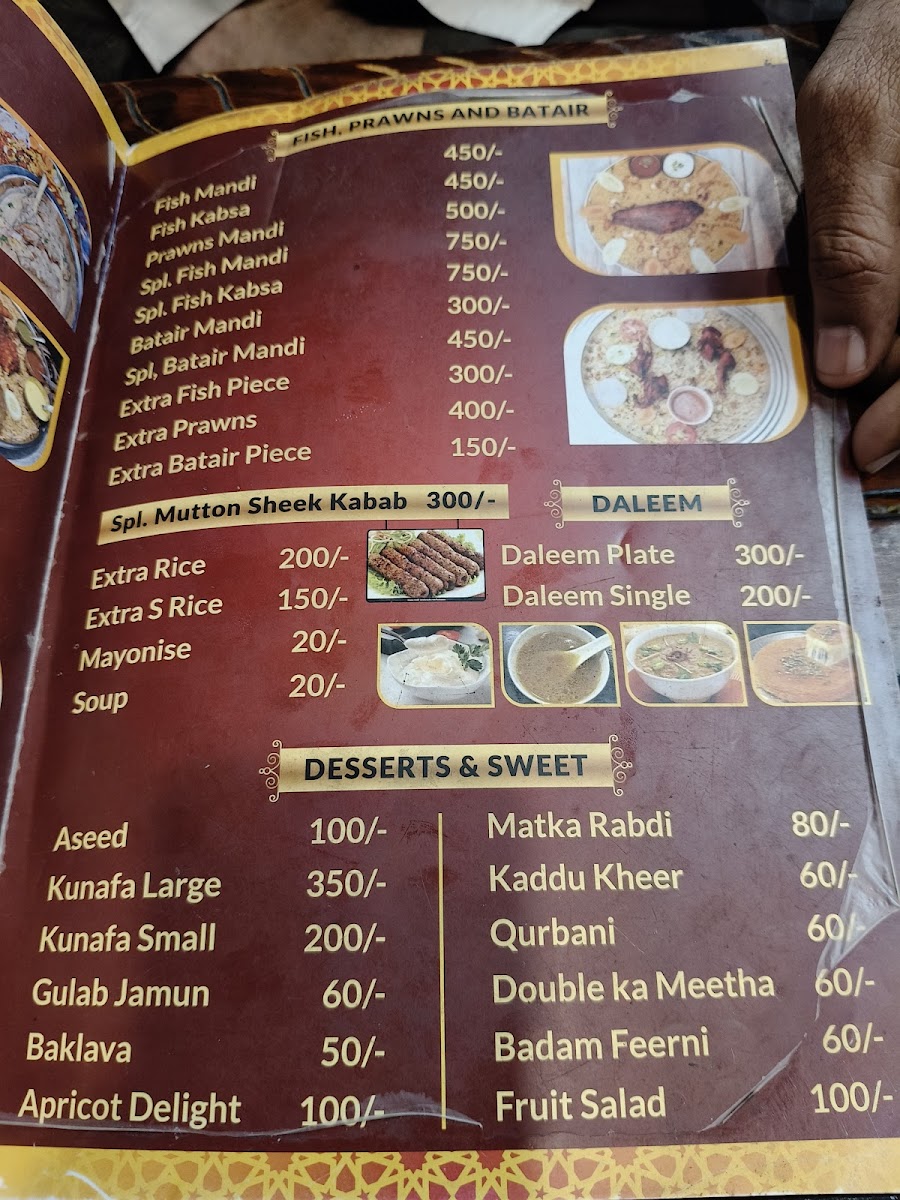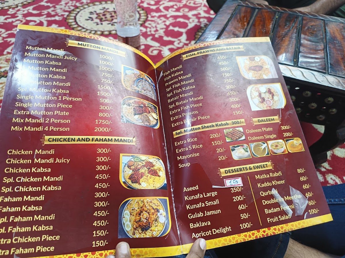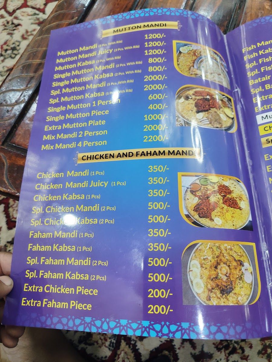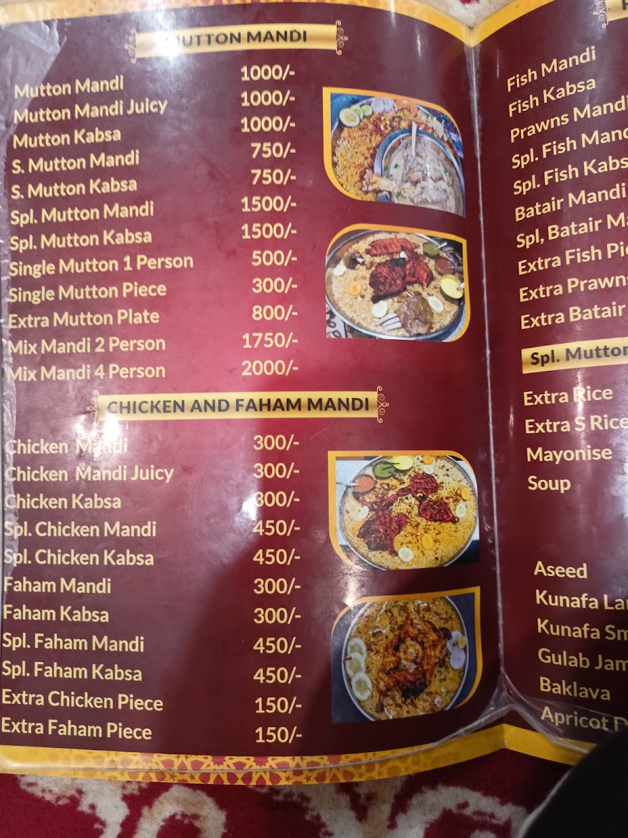 The menu features an array of dishes, from the classic Mixed Mandi, which tantalizingly combines mutton, fish, chicken, and the rare Bater (quail), offering an exceptional culinary experience. Diners have praised the Kunafa, a dessert that perfectly complements the savory offerings.